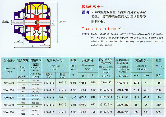 說明:YOXs型為雙腔型,傳動由兩對泵輪渦輪實現(xiàn),主要用于需傳遞較大功率切外徑受限制場合。